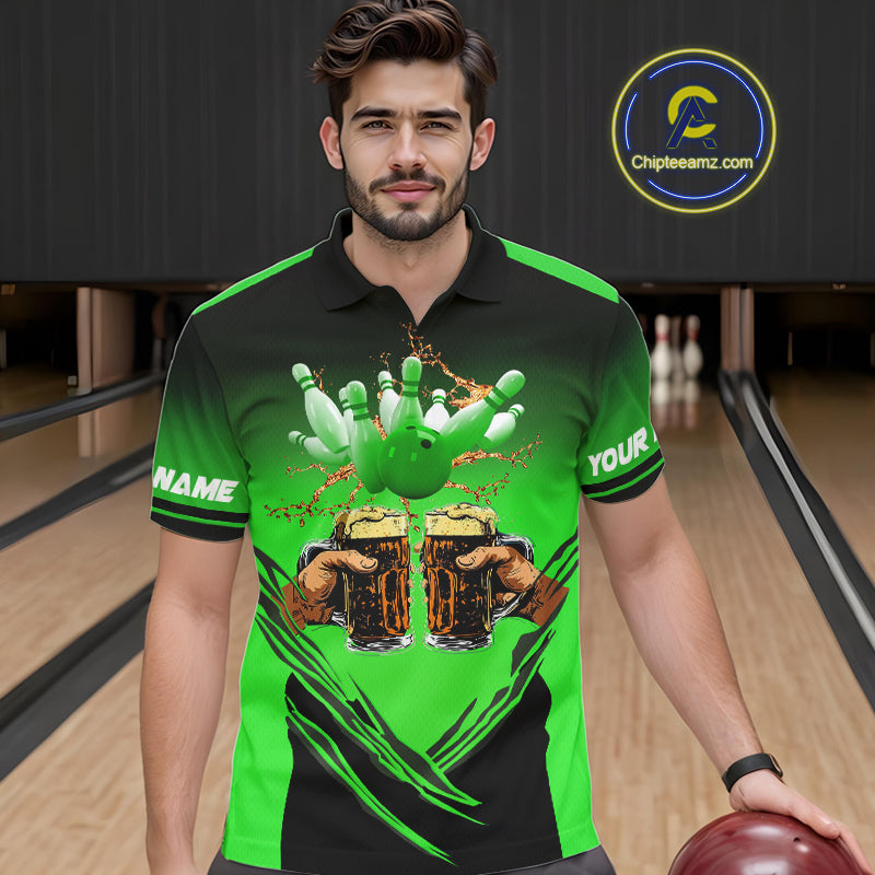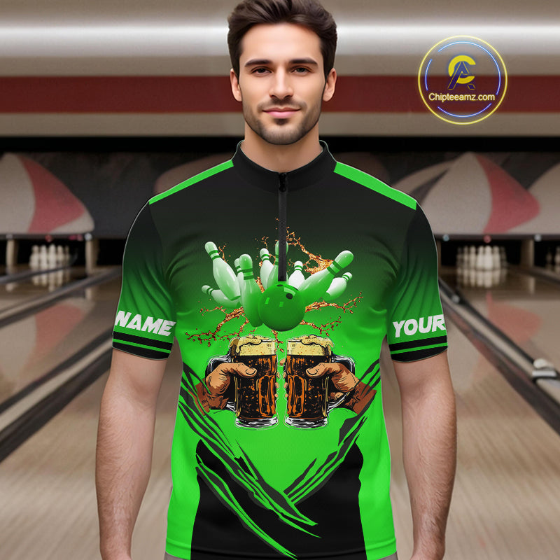 Bowling Beer Black and Green Bowling Polo, 1/4 Quarter zip shirts Custom Mens Team Bowling jerseys NQS10874