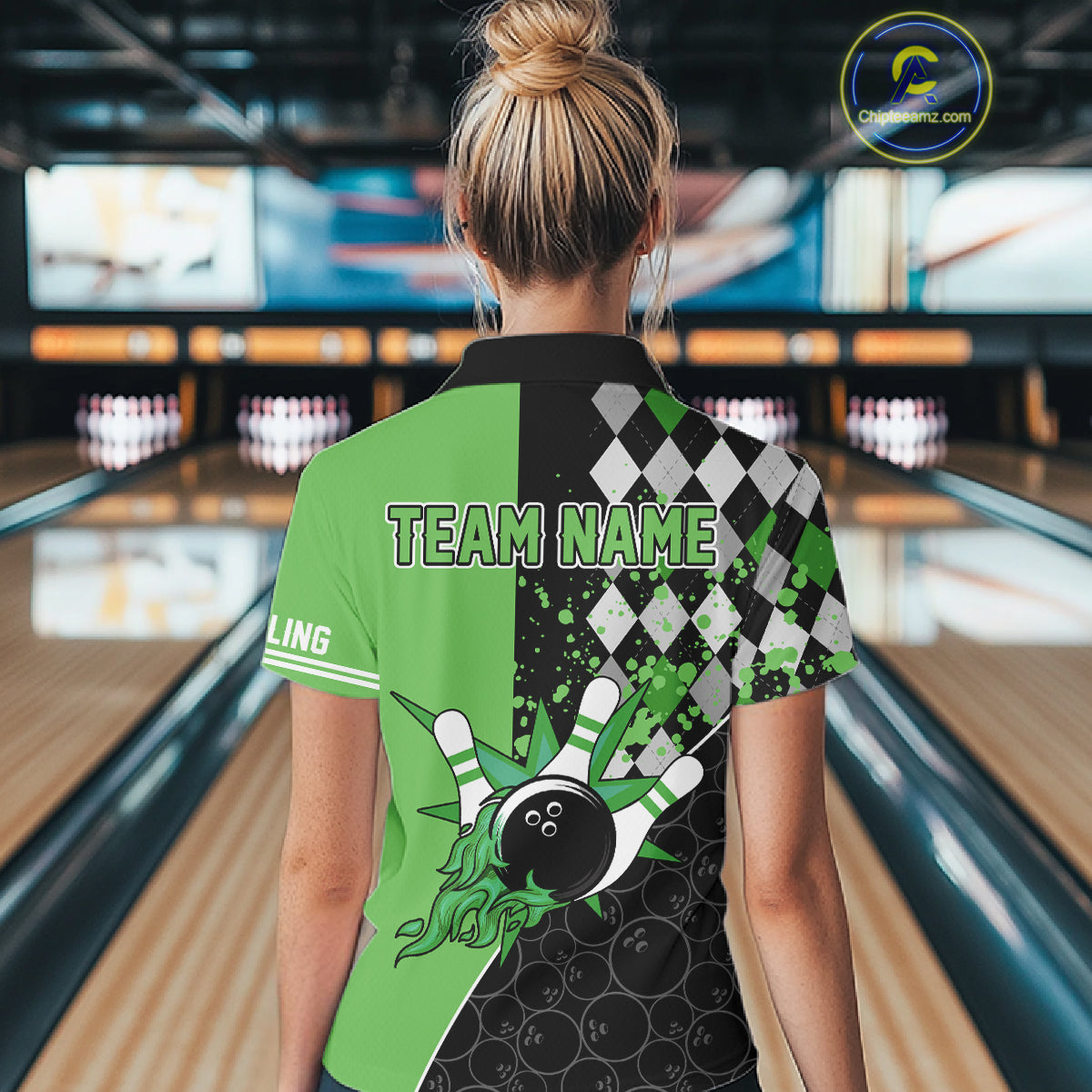 Custom Black and Green argyle pattern flame Bowling Team Jersey Bowling Polo, 1/4 Zip Shirt for Women NQS10450