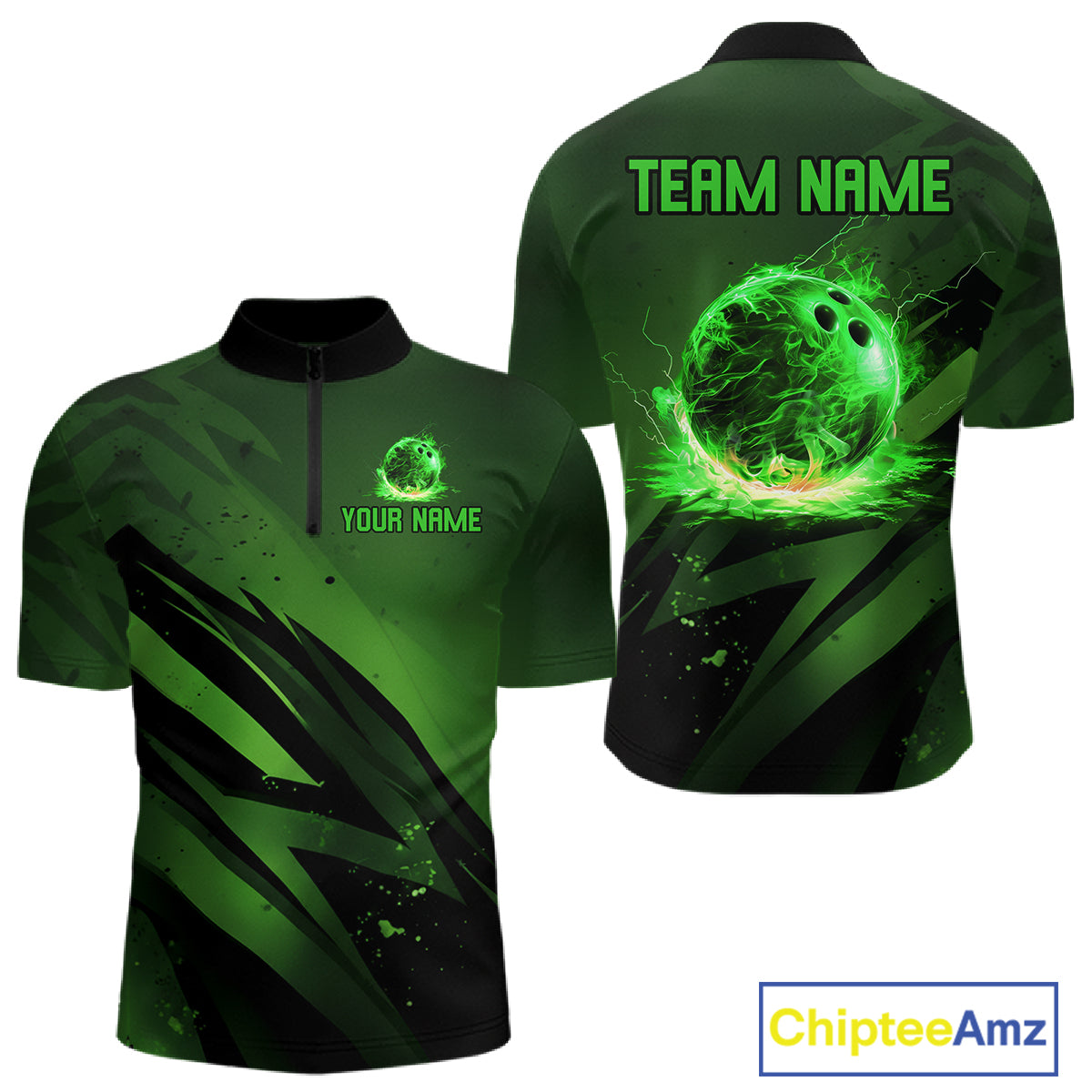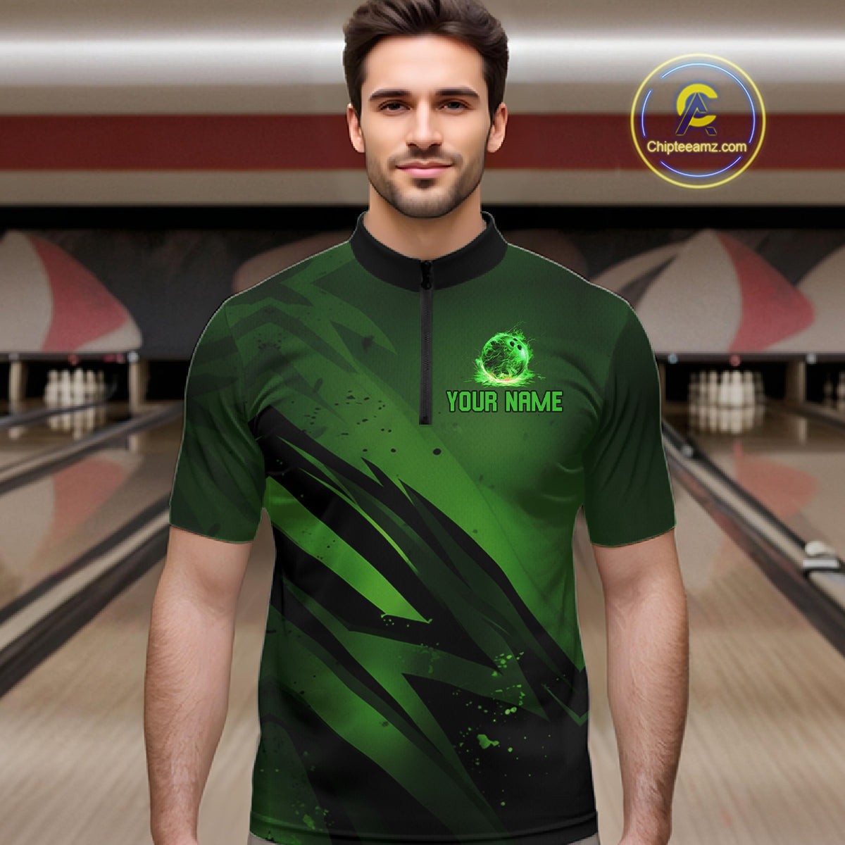 Custom Black and Green Flame Mens Bowling Shirts, Bowling Polo, 1/4 Zip Team Jerseys NQS11130