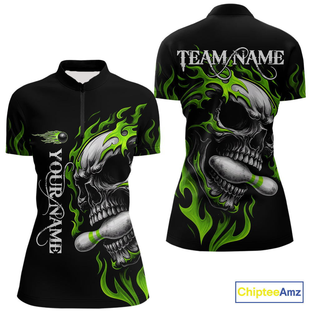 Custom Black and Green Flame Skull Bowling Shirts For Women, Personalized Skull Team Bowling Jersey NQS10793