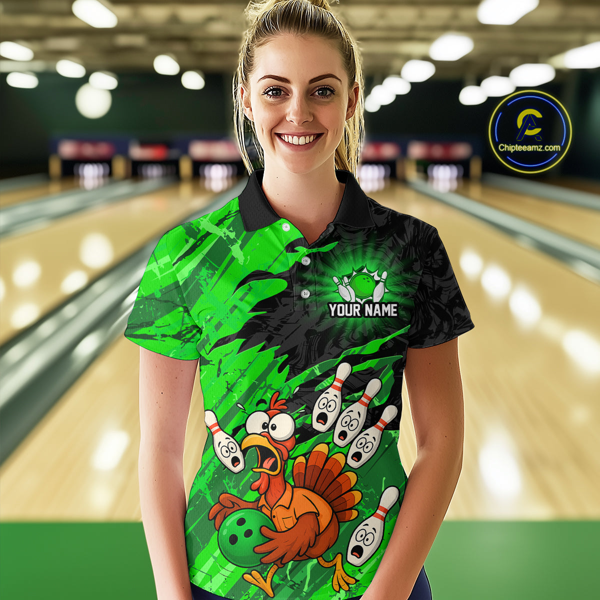 Custom Green Turkey Bowling Shirt Funny Ball Pin League Jersey for Women Polo Outfit QZT765