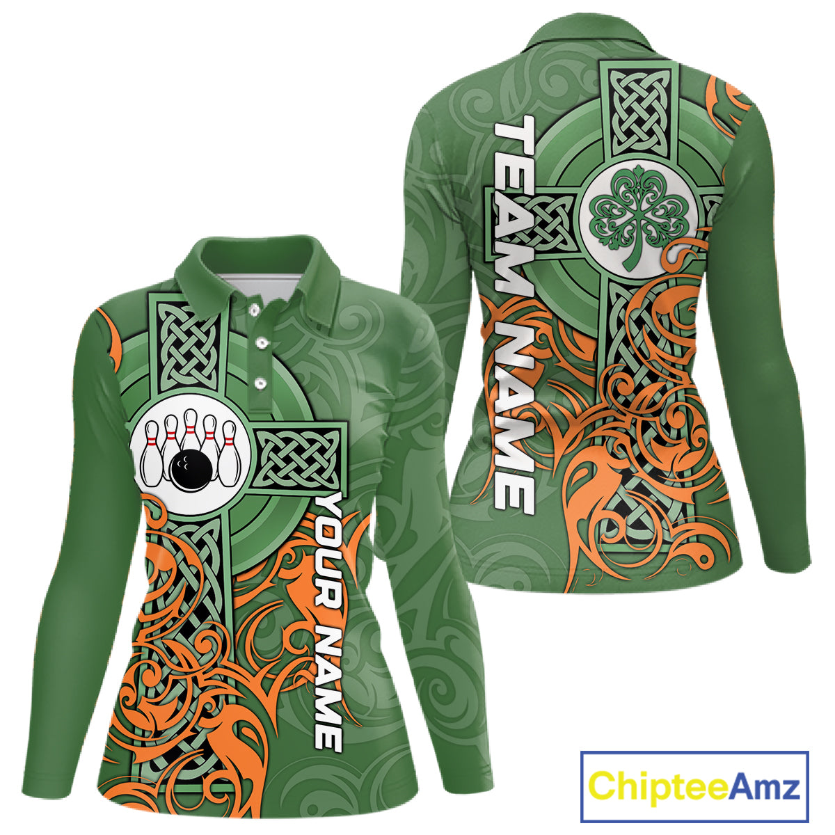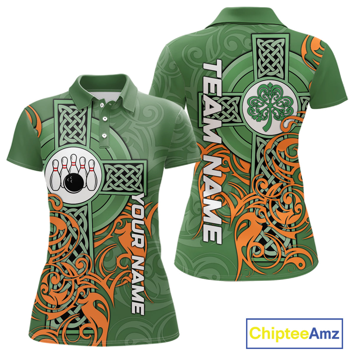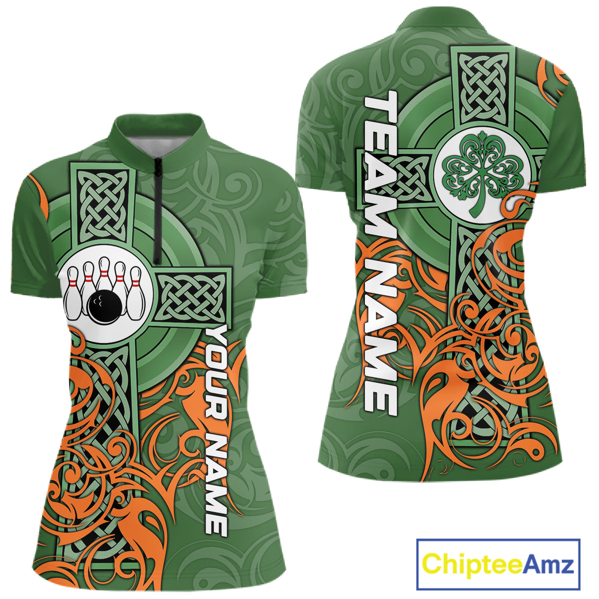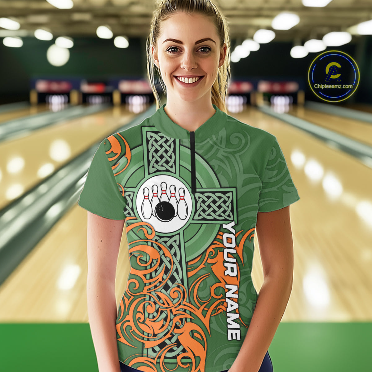 Green and orange Irish Tribal Cross St Patrick's Day Women bowling shirts Custom Lucky Bowling Jersey NQS11255