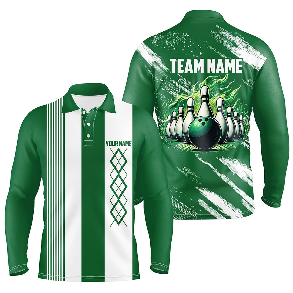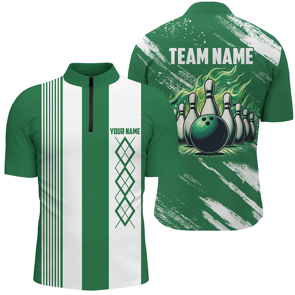 Green and White Argyle Flame bowling Men Polo, 1/4 Quarter Zip Shirts Custom bowling team jerseys NQS8110