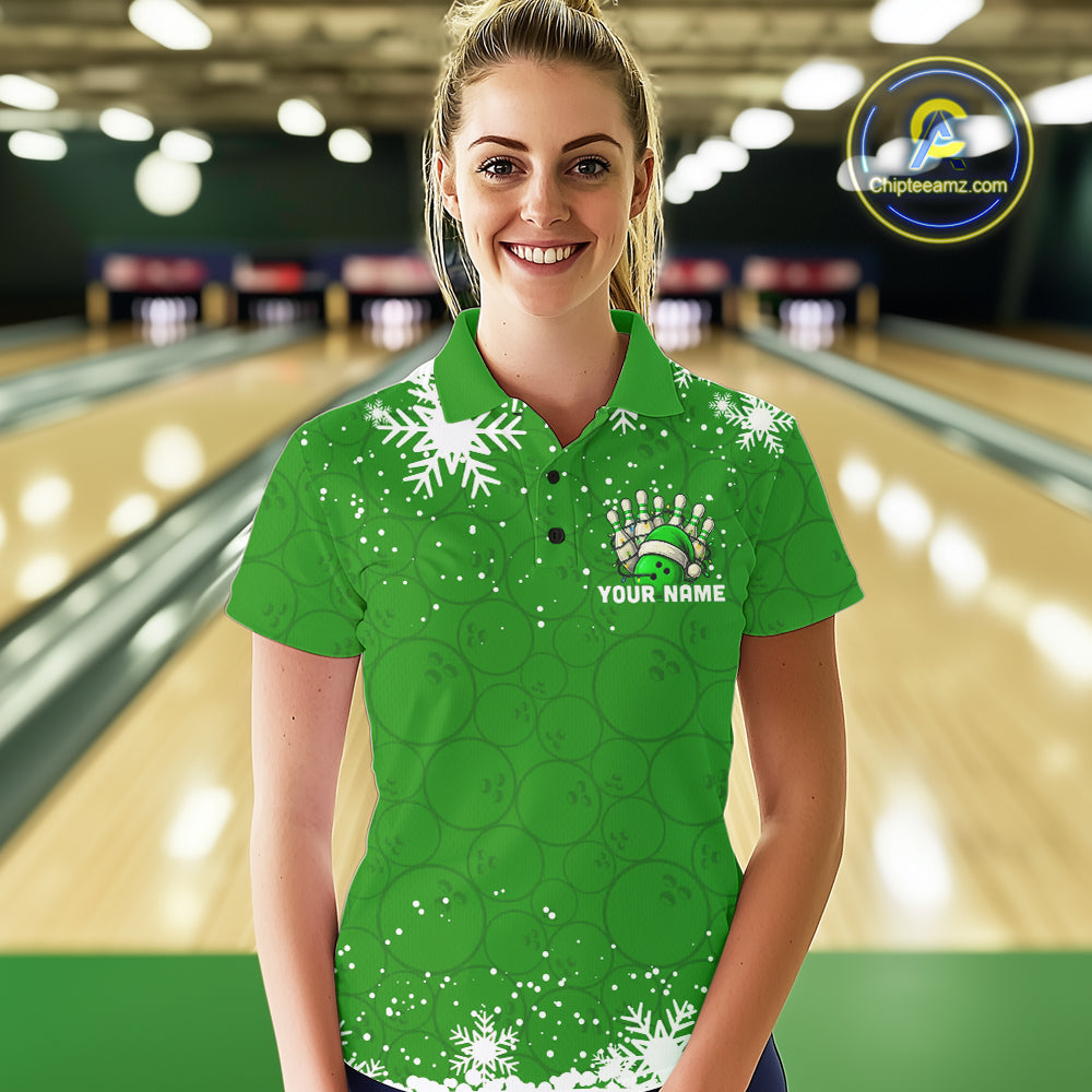 Green Christmas Bowling snowflake Women's Bowling Polo, Quarter Zip shirt Custom Xmas Bowling Outfits NQS10996