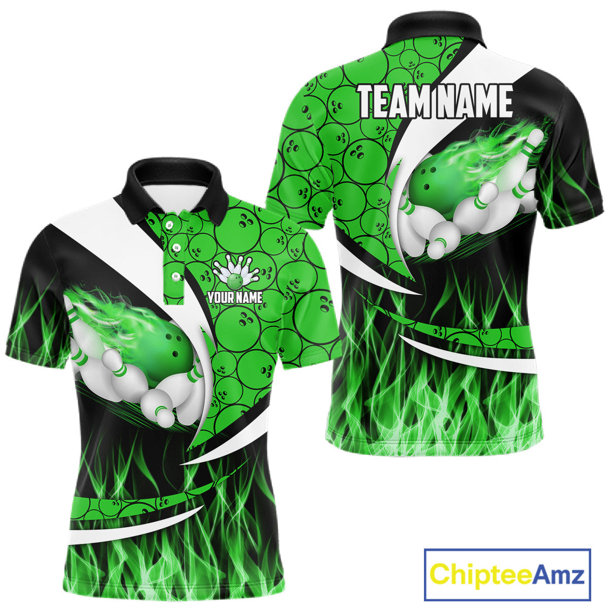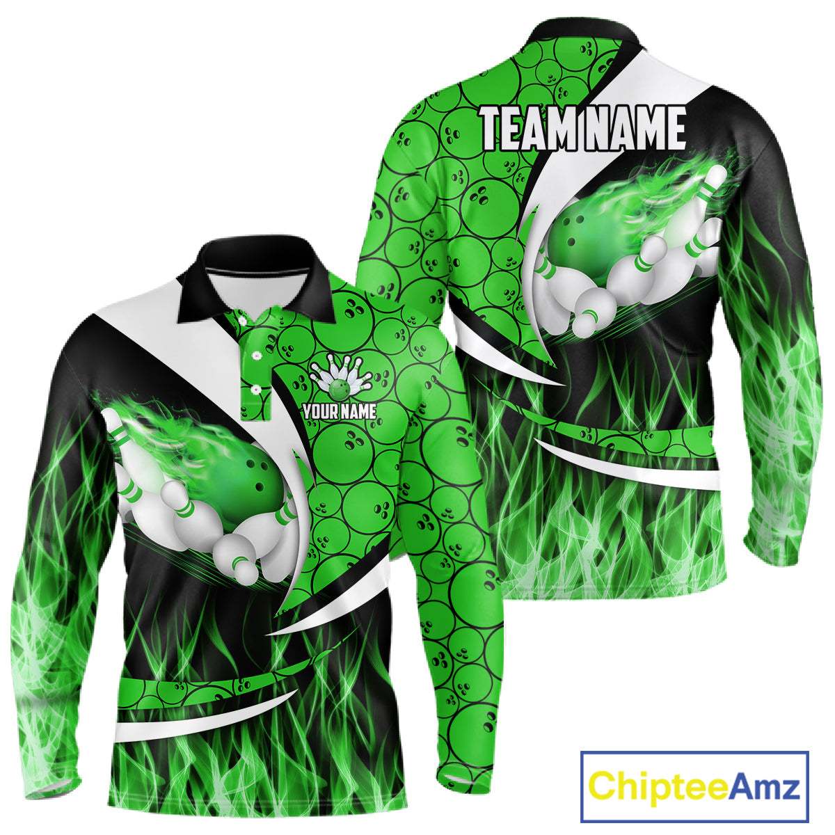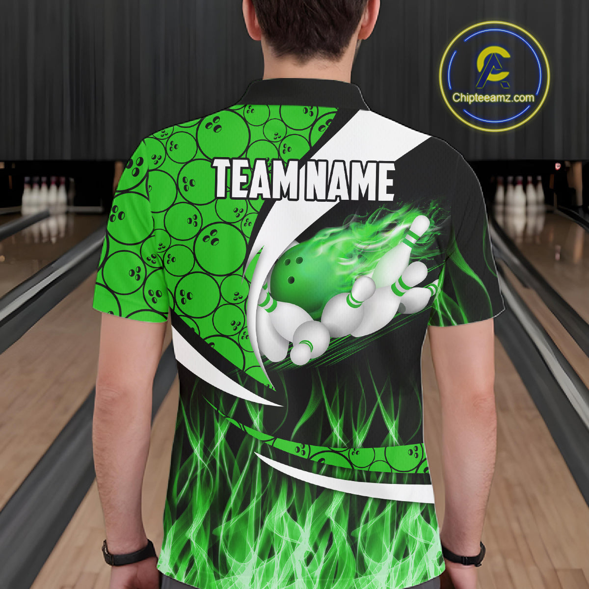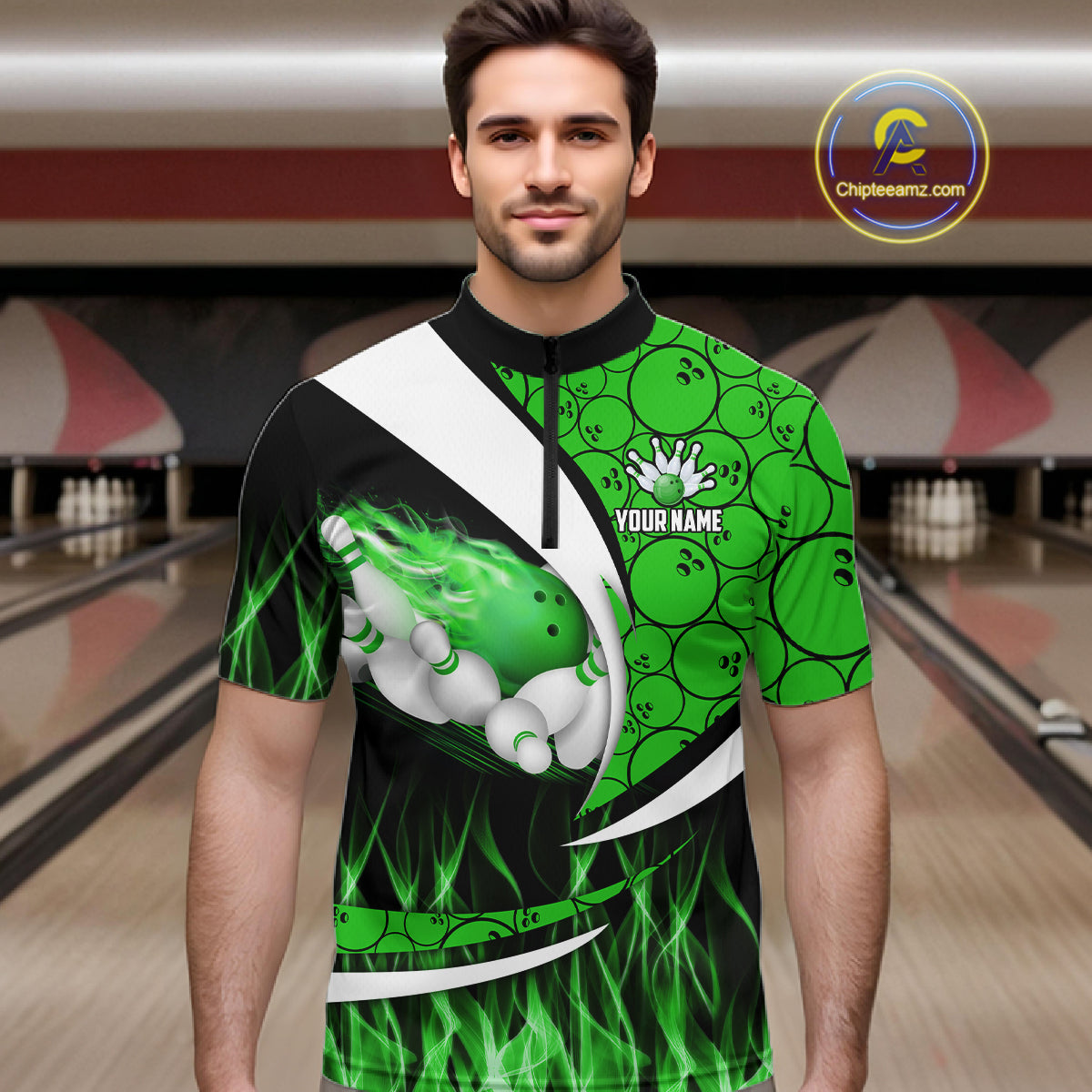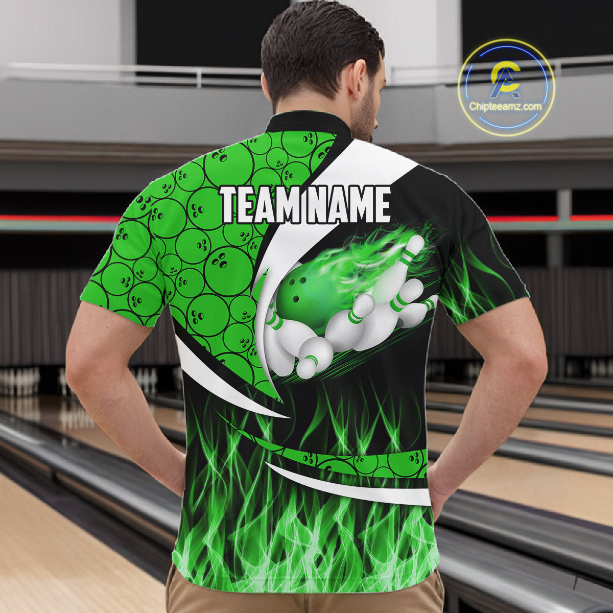 Green Flame Bowling Camo Bowling Polo, Quarter Zip Shirts For Men Custom Bowling Team Bowler Jerseys NQS11196