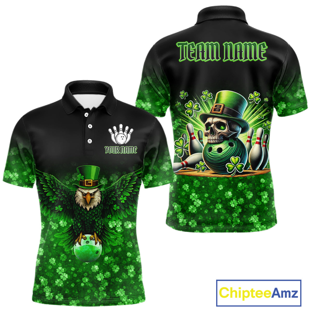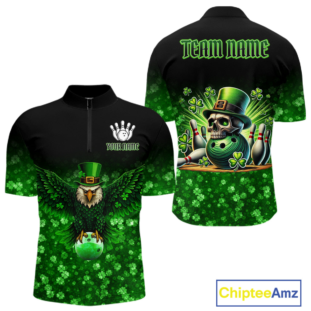 Green shamrock St Patrick's Day Eagle Skull Men's Bowling Shirts Custom Lucky Bowling Team Jersey NQS11287
