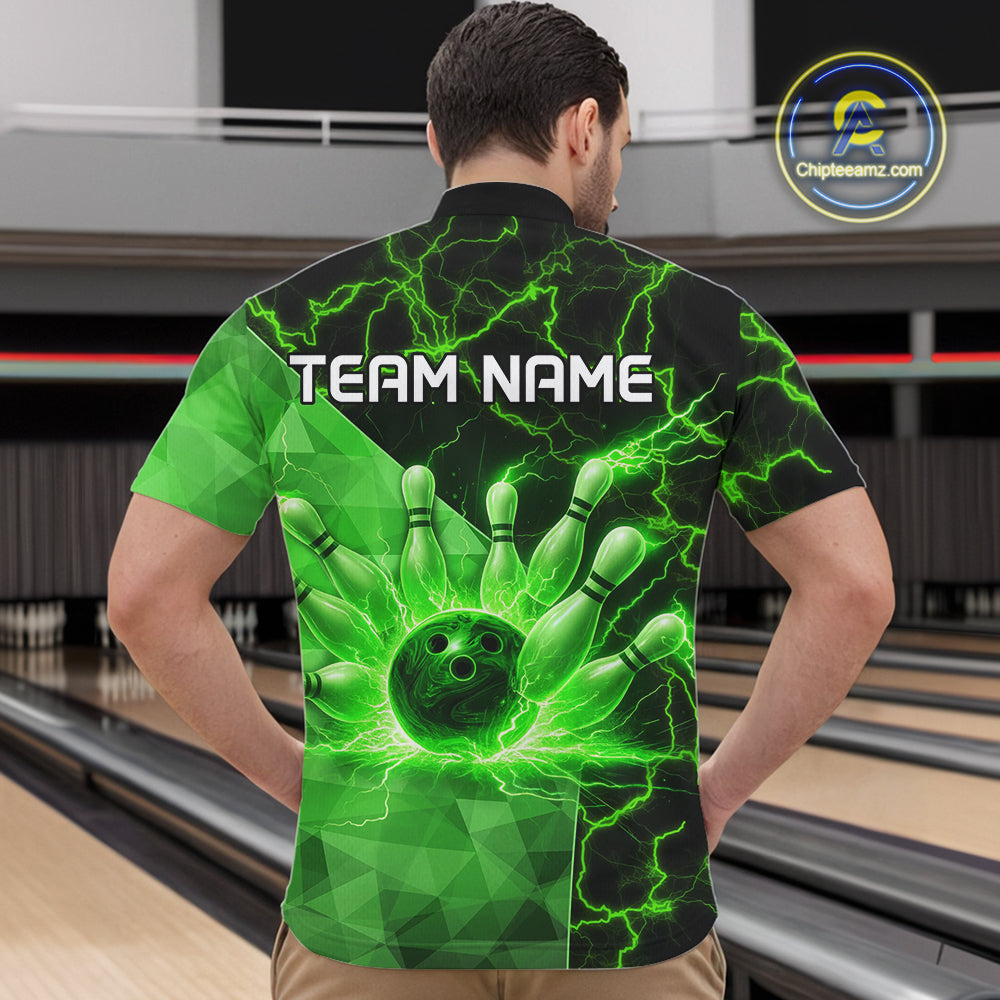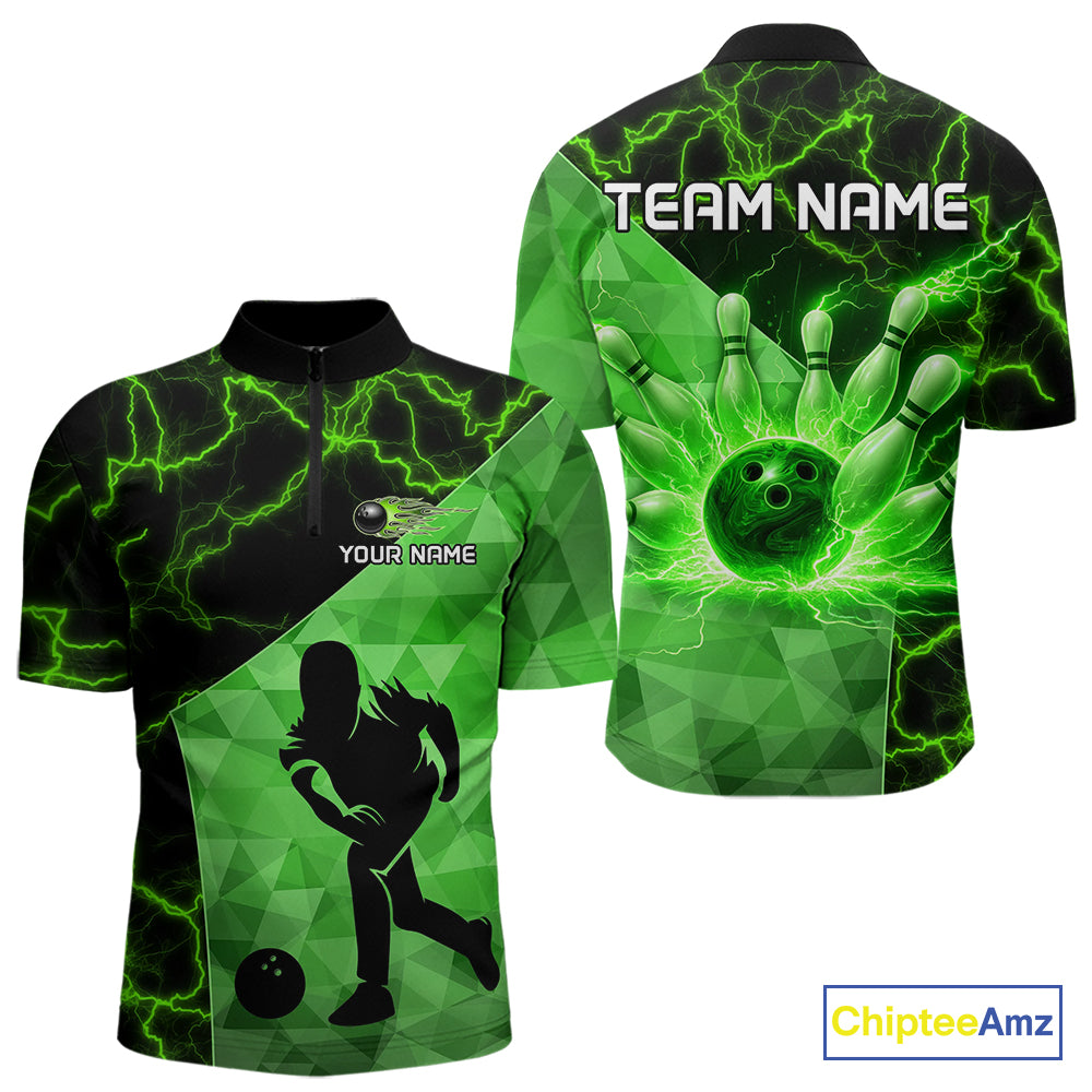 Green Thunder Lightning Bowling Polo, Quarter Zip Shirts For Men Custom Team Bowling Outfit NQS10821