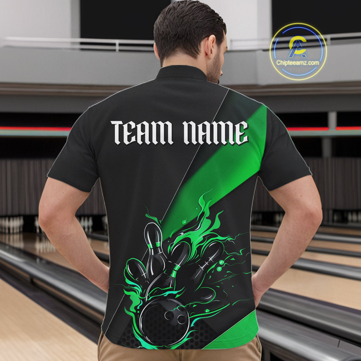 Black And Green Custom Flame Bowling Tournament Jerseys For Men, Bowling Team Shirts IPHW7926