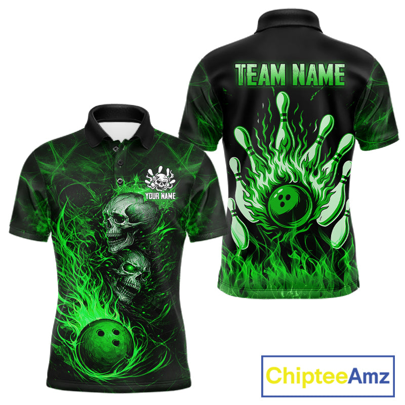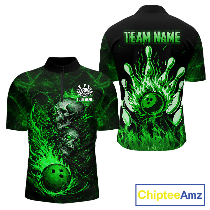 Green Flaming Skull Bowling Shirts For Men Custom Fire Bowling Team Jersey Polo & Quarter Zip TDM5618