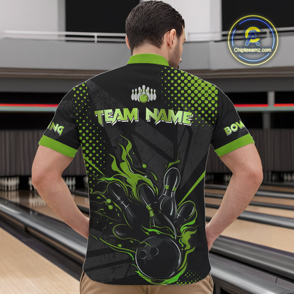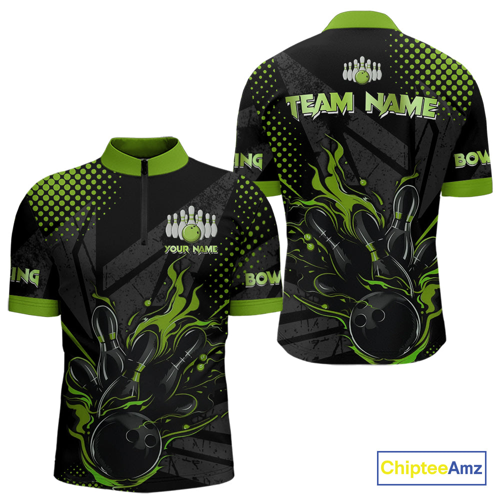 Personalized Black and Green Flame Bowling Polo, 1/4 Zip Shirts For Men, Custom bowling Team Jerseys NQS10772