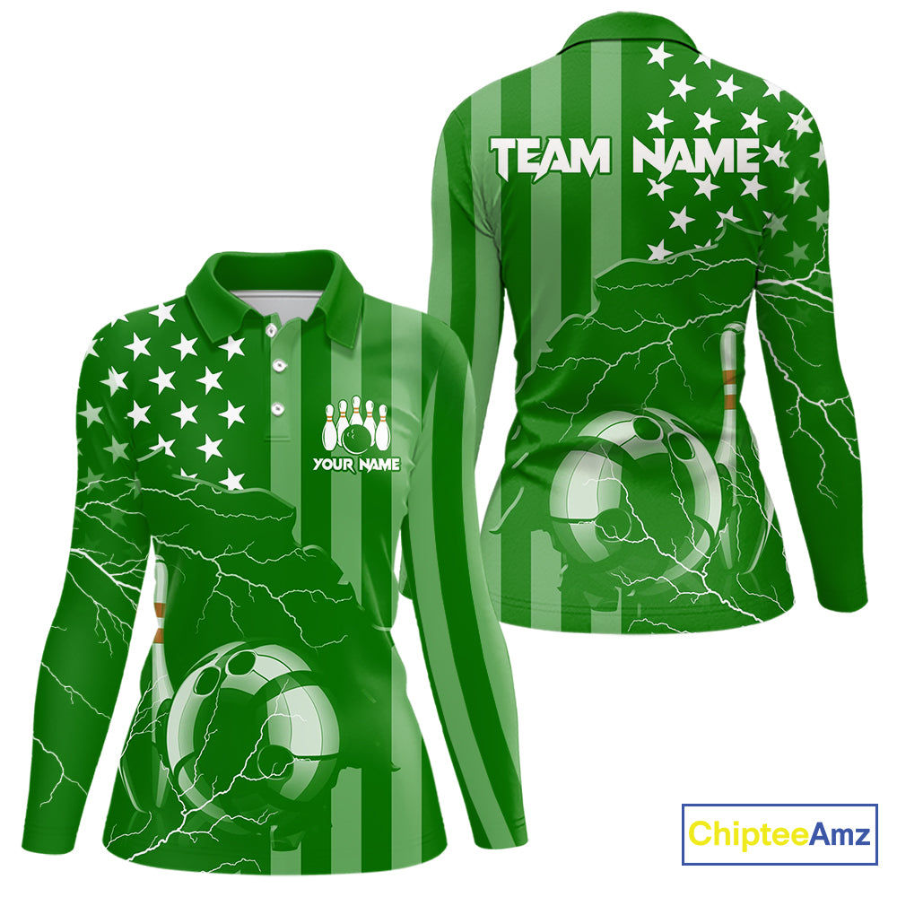 Personalized Green American flag Lightning thunder Custom Bowling Team Shirt For Women Bowling Jersey NQS10487