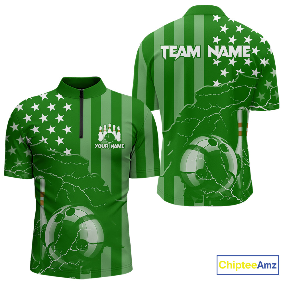 Personalized Green American flag Lightning thunder Custom Bowling Team Shirts For Mens Bowling Jersey NQS10487