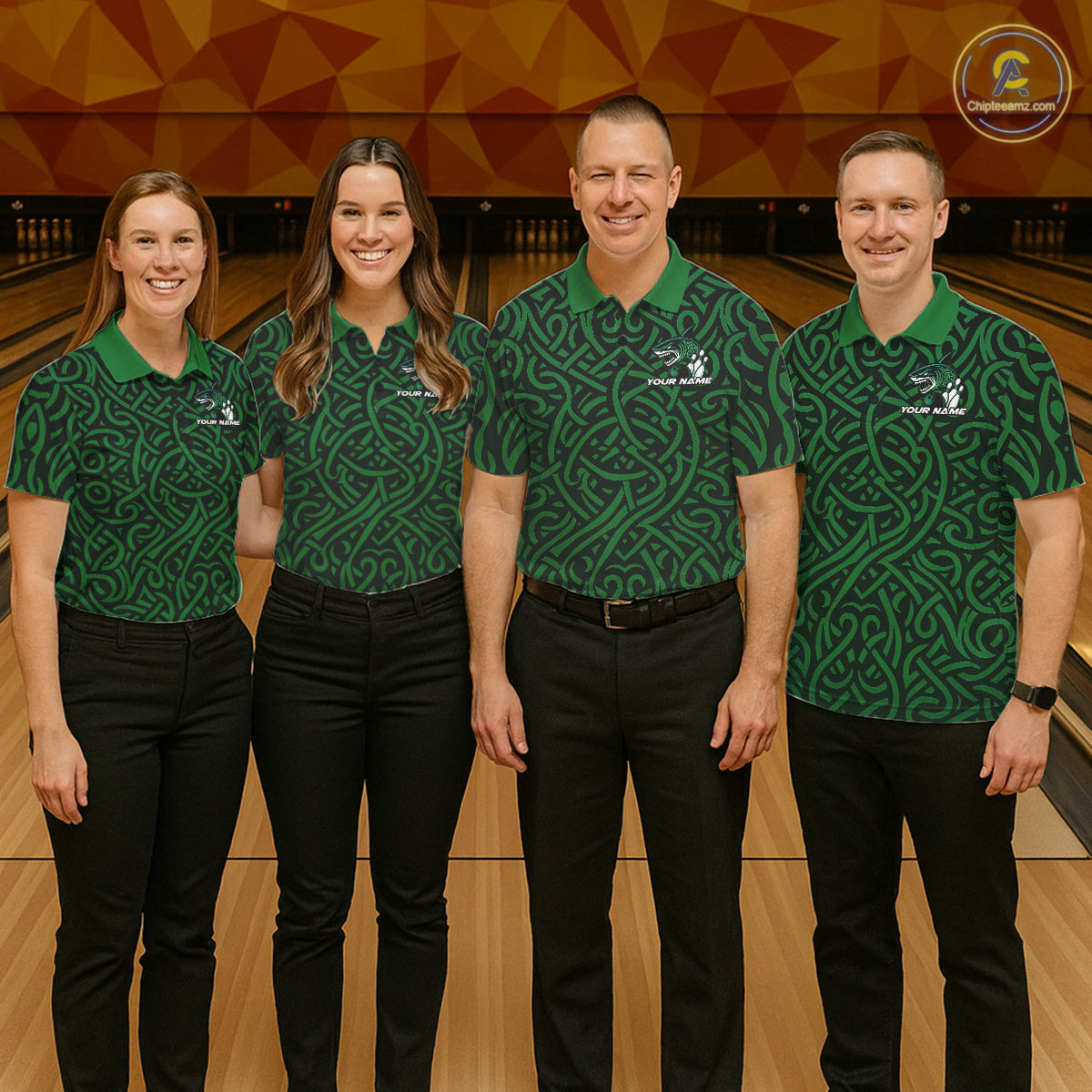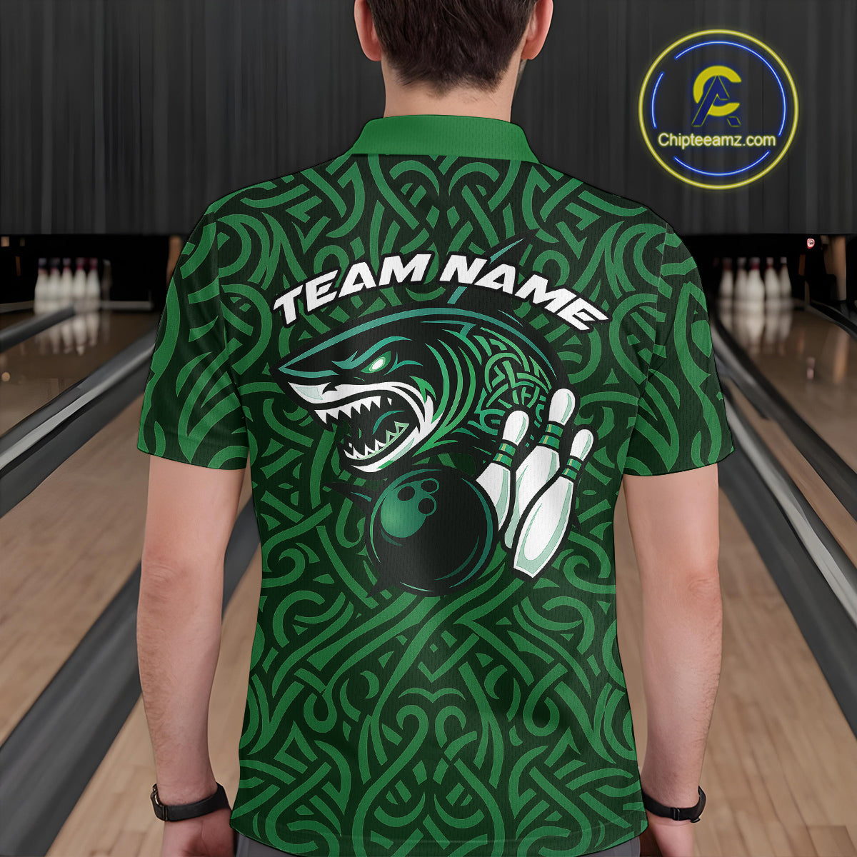 Custom Green Tribal Shark Bowling Team Men Polo Shirt, Shark Bowling Tournament Shirt IPHW10176