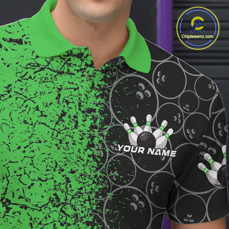 Custom Black And Green Splatter Bowling Ball Pattern Bowling Team Polo Shirts For Men IPHW9792