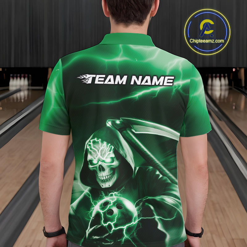 Custom Green Lightning Grim Reaper Bowling Polo Shirts For Men, Halloween Bowling Jerseys IPHW9844