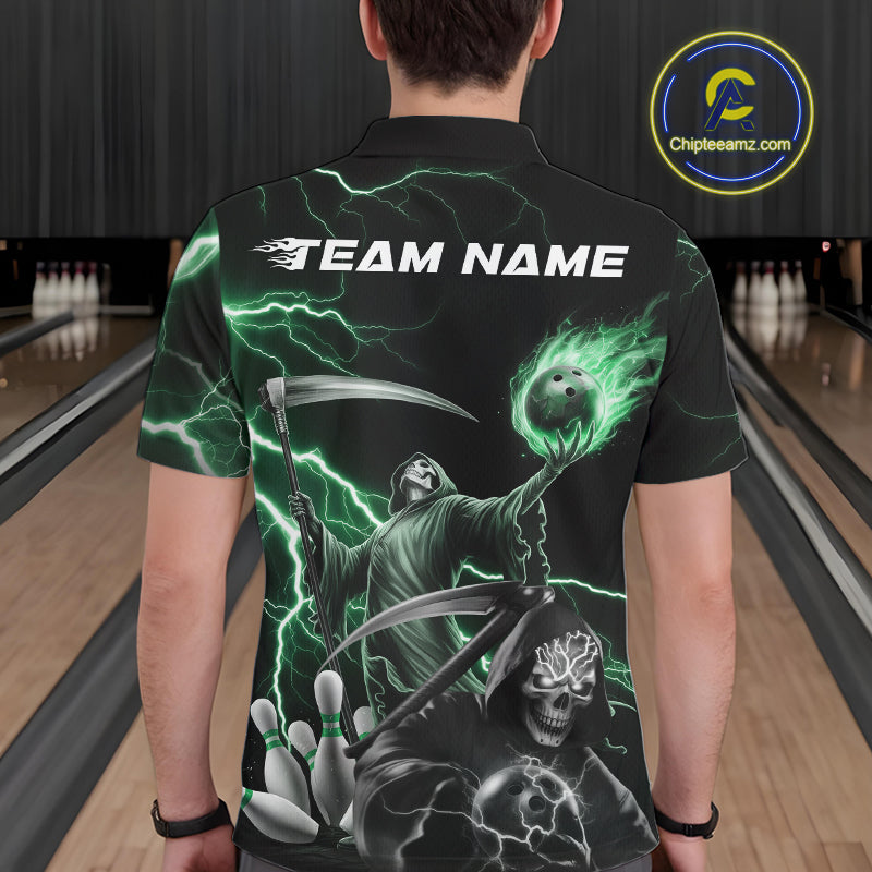 Custom Green Lightning Grim Reaper Skull Bowling Men Polo Shirt, Halloween Outfit IPHW9850