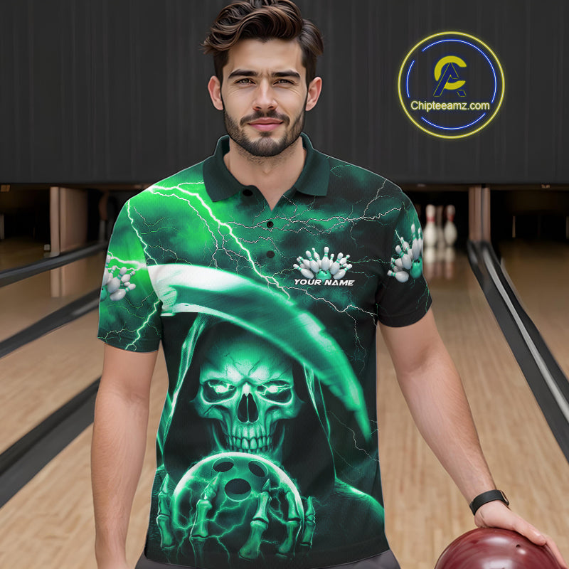 Custom Green Thunder Lightning Grim Reaper Skull Halloween Bowling Polo Shirts For Men IPHW9852