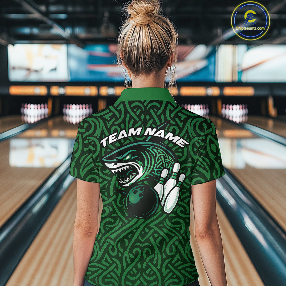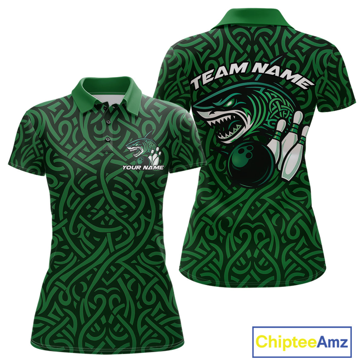 Custom Green Tribal Shark Bowling Team Women Polo Shirt, Shark Bowling Tournament Shirt IPHW10176