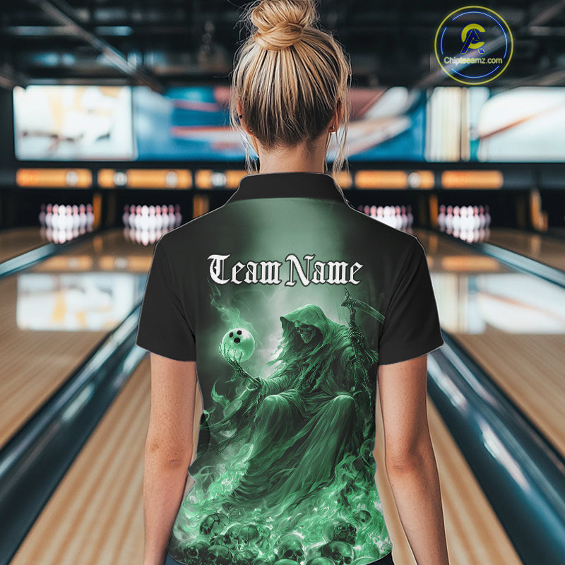 Custom Green Flame Grim Reaper Bowling Women Polo Shirts, Halloween Bowling Team Outfit IPHW9469