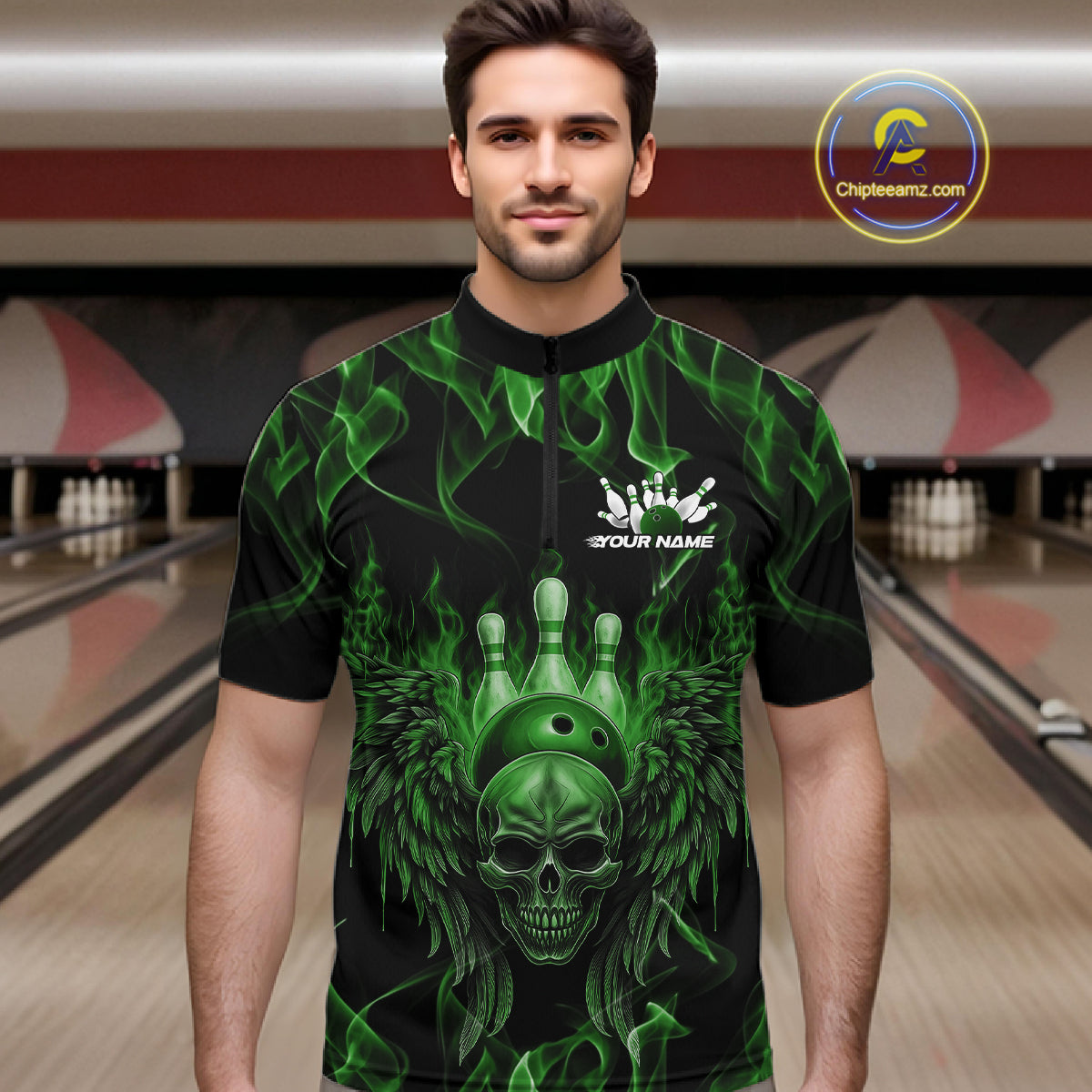Custom Black And Green Flame Skull With Wings Men Bowling Shirt, Halloween Team Shirt IPHW10167