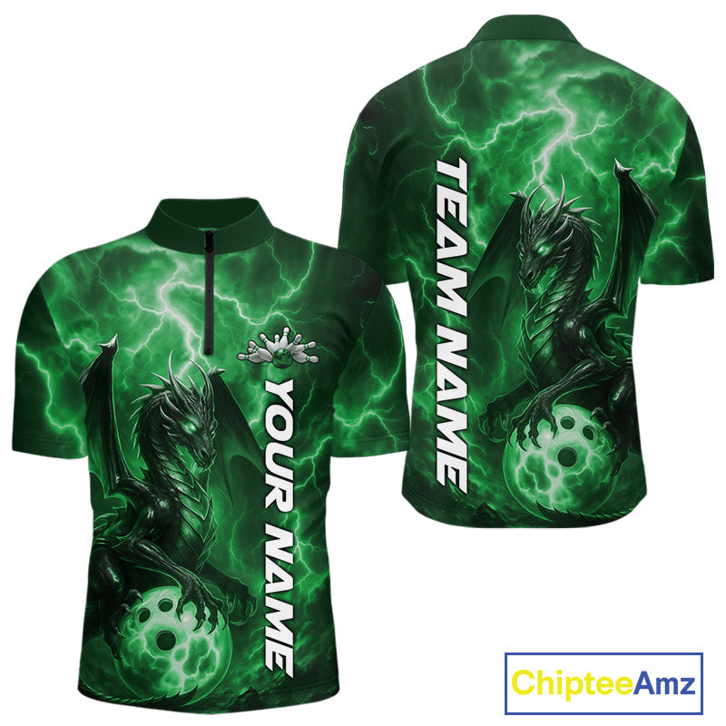 Custom Green Thunder Lightning Bowling Team Men Quarter-Zip Shirt, Dragon Bowling Jerseys IPHW10199