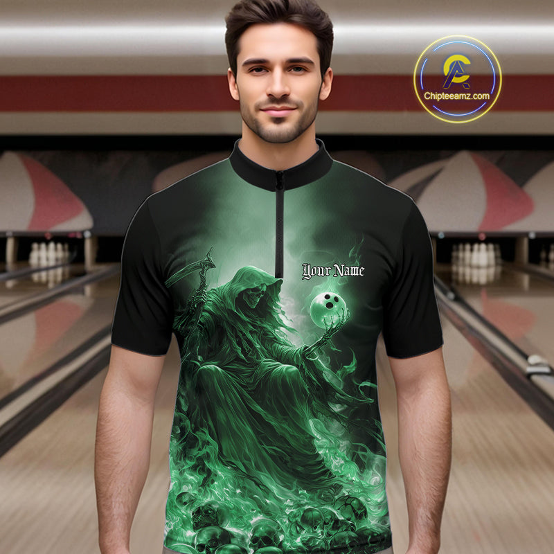Custom Green Flame Grim Reaper Bowling Men Quarter-Zip Shirts, Halloween Bowling Team Outfit IPHW9469