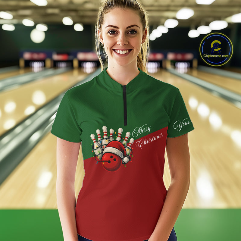 Red and Green Christmas Bowling Polo, Quarter Zip Shirts For Women custom Ladies bowling jerseys NQS11052
