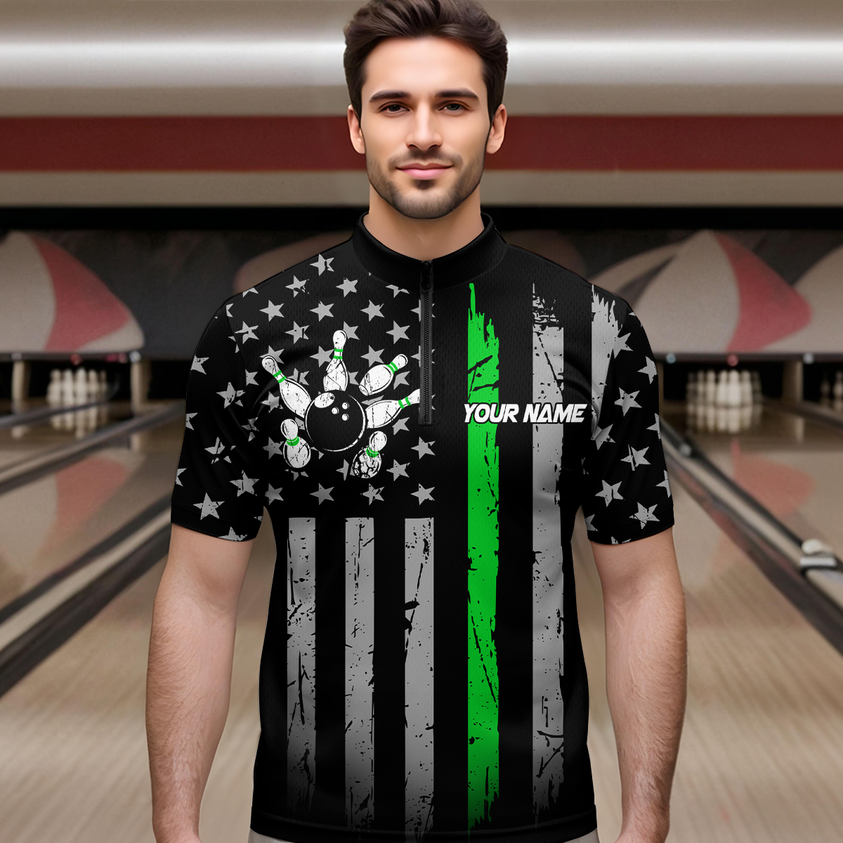 US Green Flag Bowling Shirt for Men Custom Name Polo & Quarter-Zip Bowling Jersey Bowling Team Shirt HNT23