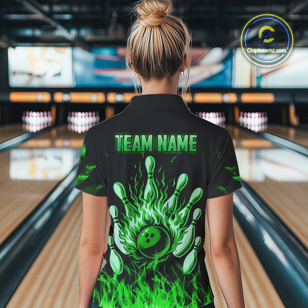 Green Flaming American Flag Skull Bowling Shirt For Women Custom Fire Bowling Team Jersey TDM4656