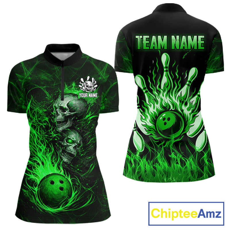 Green Flaming Skull Bowling Shirts For Women Custom Fire Bowling Team Jersey Polo & Quarter Zip TDM5618