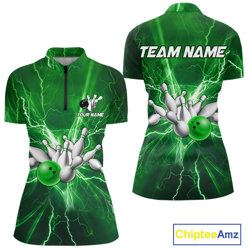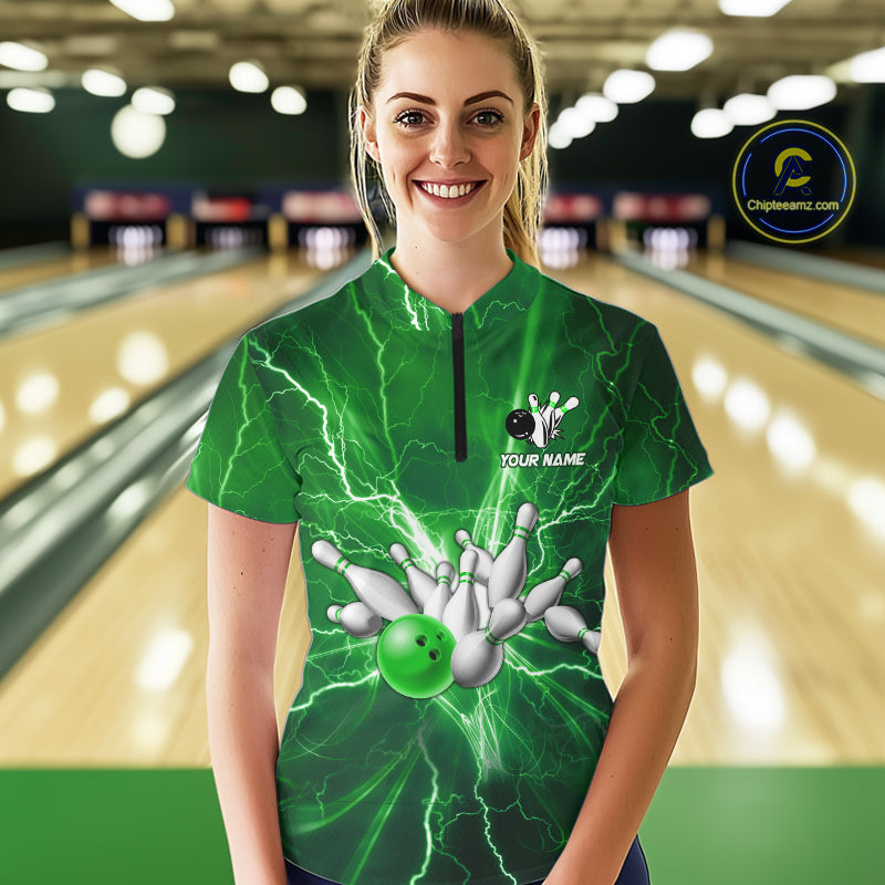 Women's Bowling Shirts Custom Green Lightning Thunder Bowling Team Jersey, gift for team Bowlers NQS10602