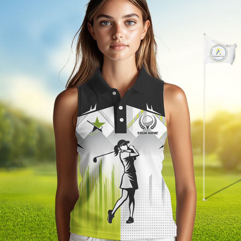 Black and White Women sleeveless polo shirt Custom ladies Golf top, personalized golf gifts | Green NQS10127