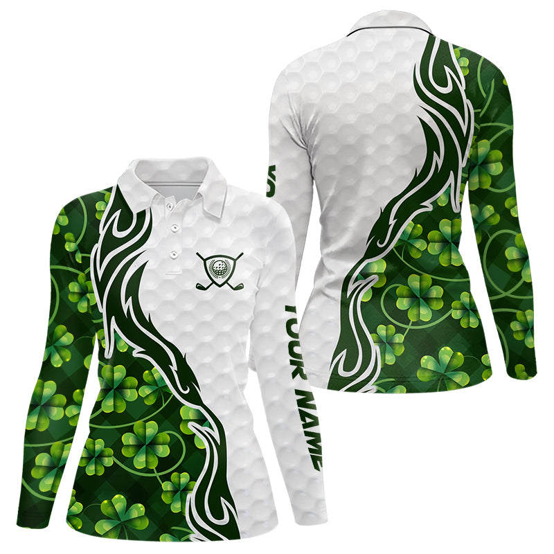 Custom White and Green shamrock pattern Women Golf Polo Shirts, St Patrick's day team ladies golf top NQS11208