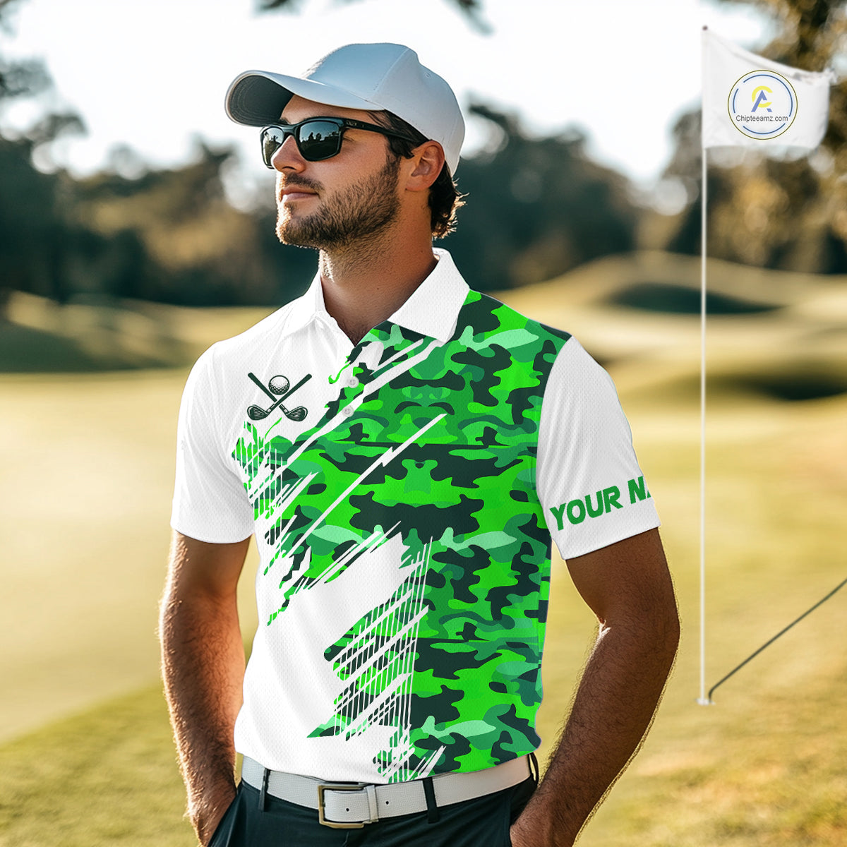Personalized Mens golf polo shirts custom white and green camo mens golf apparel, golfing gifts NQS10334