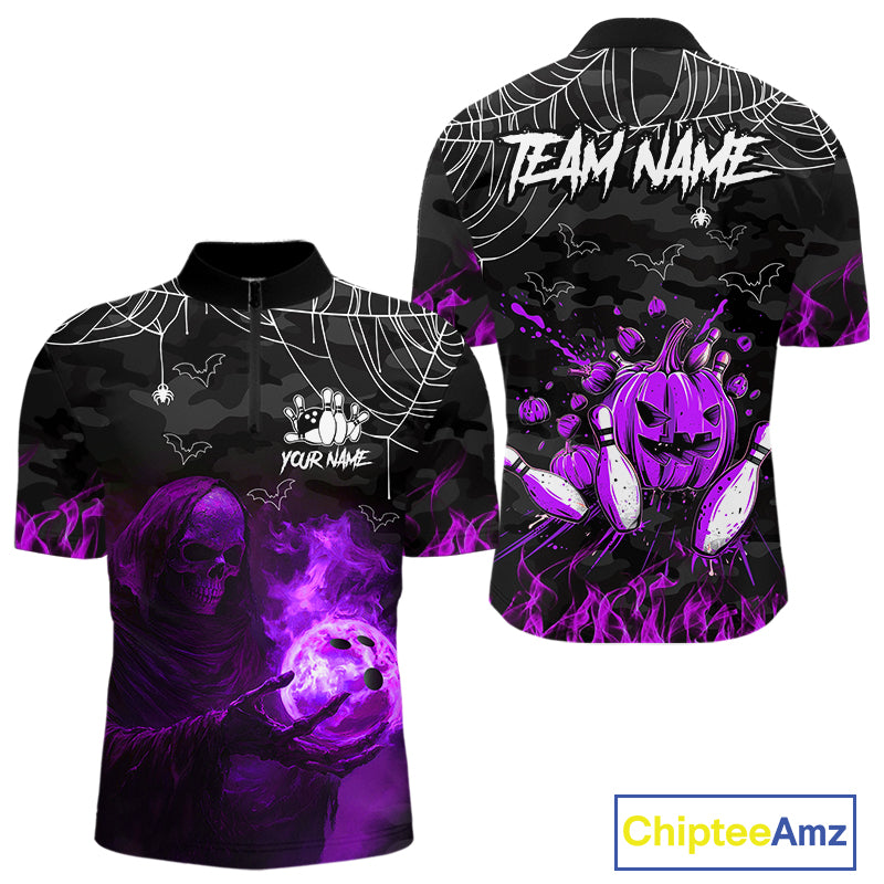 Black Bowling Camo Purple flame Skull Custom Halloween Bowling Shirts For Men, Bowling Team Jerseys NQS10706
