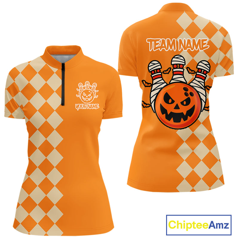 Orange Argyle Pattern Custom Halloween Ladies Bowling Shirts, Personalized Bowling Team Shirt NQS10466