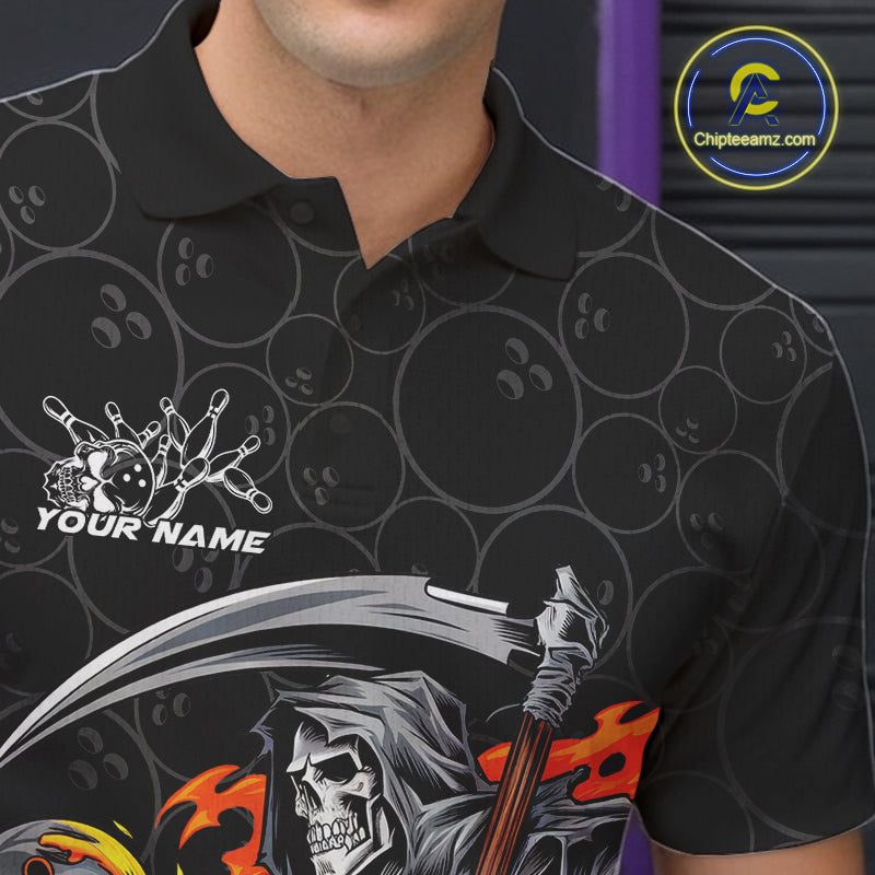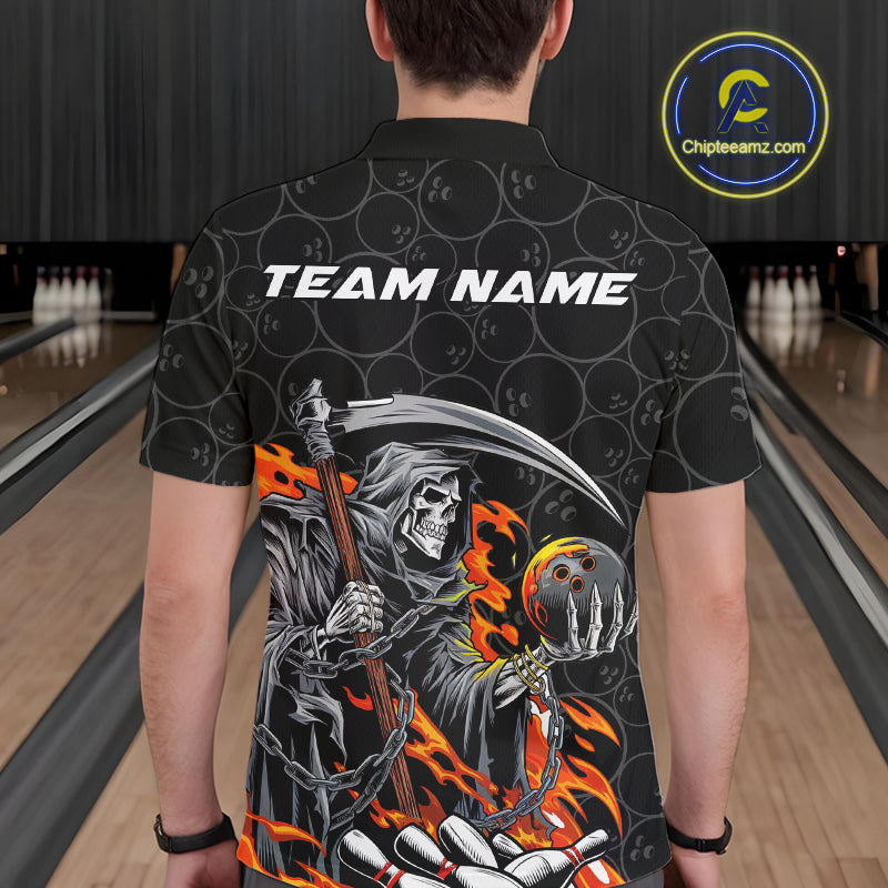 Custom Chatic Flame Grim Reaper Bowling Polo Shirts For Men, Halloween Bowling Team Shirt IPHW9473