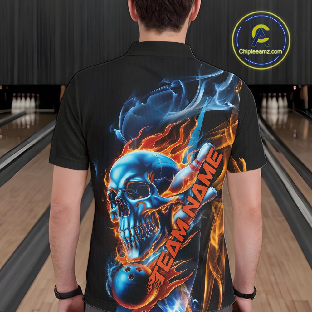 Custom Blue And Orange Fire Flame Strike Skull Bowling Men Polo Shirt, Halloween Outfit IPHW9890