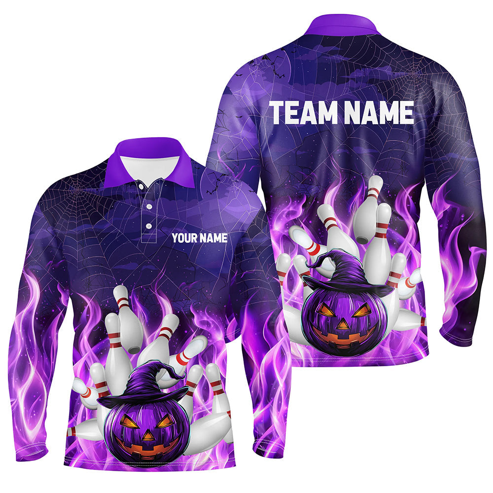 Purple Flame Halloween Pumpkin Bowling Polo, Quarter Zip Shirts For Men Custom Team Bowling Jerseys NQS8629