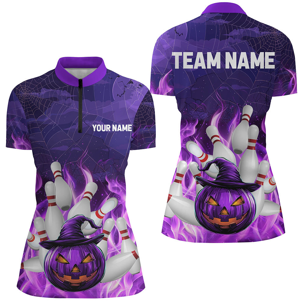 Purple Flame Halloween Pumpkin Bowling Polo, Quarter Zip Shirts For Women Custom Team Bowling Jerseys NQS8629