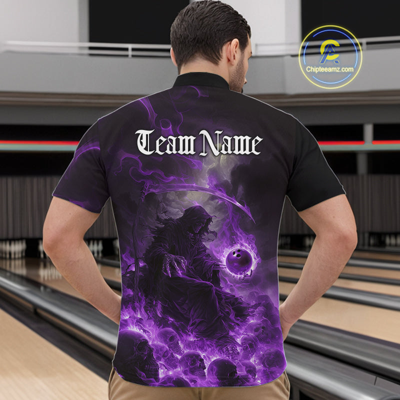 Custom Purple Fire Grim Reaper Bowling Quarter-Zip Shirts For Men, Halloween Bowling Shirt IPHW9466