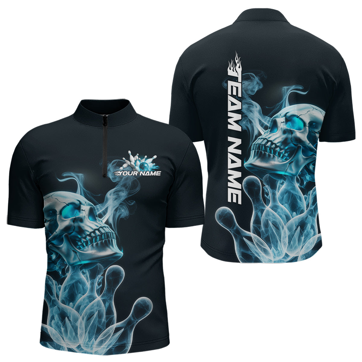 Custom Blue Flame Smoke Skull Bowling Quarter-Zip Shirts For Men, Halloween Bowling Outfit IPHW9494