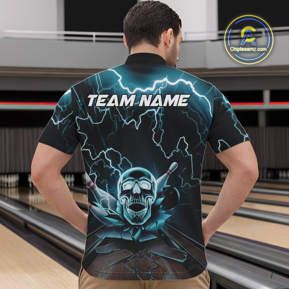 Custom Blue Thunder Lightning Skull Bowling Quarter-Zip Team Shirts For Men, Halloween Outfit IPHW9497