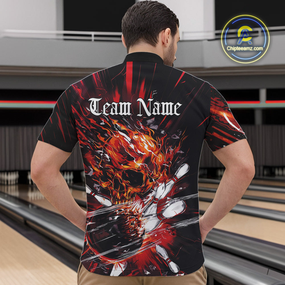 Custom Flame Skull Bowling Team Men Quarter-Zip Shirts, Fire Halloween Bowler Outfit Uniform IPHW9583