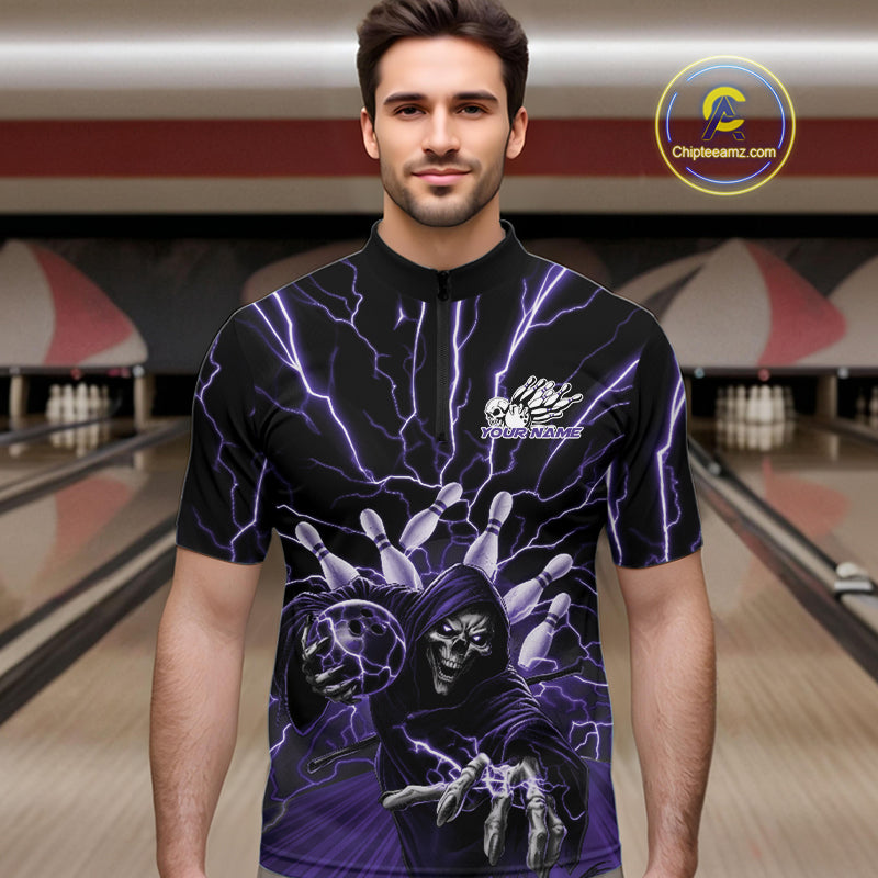 Custom Black And Purple Lightning Grim Reaper Bowling Men Quarter-Zip Shirt, Halloween Outfit IPHW9805