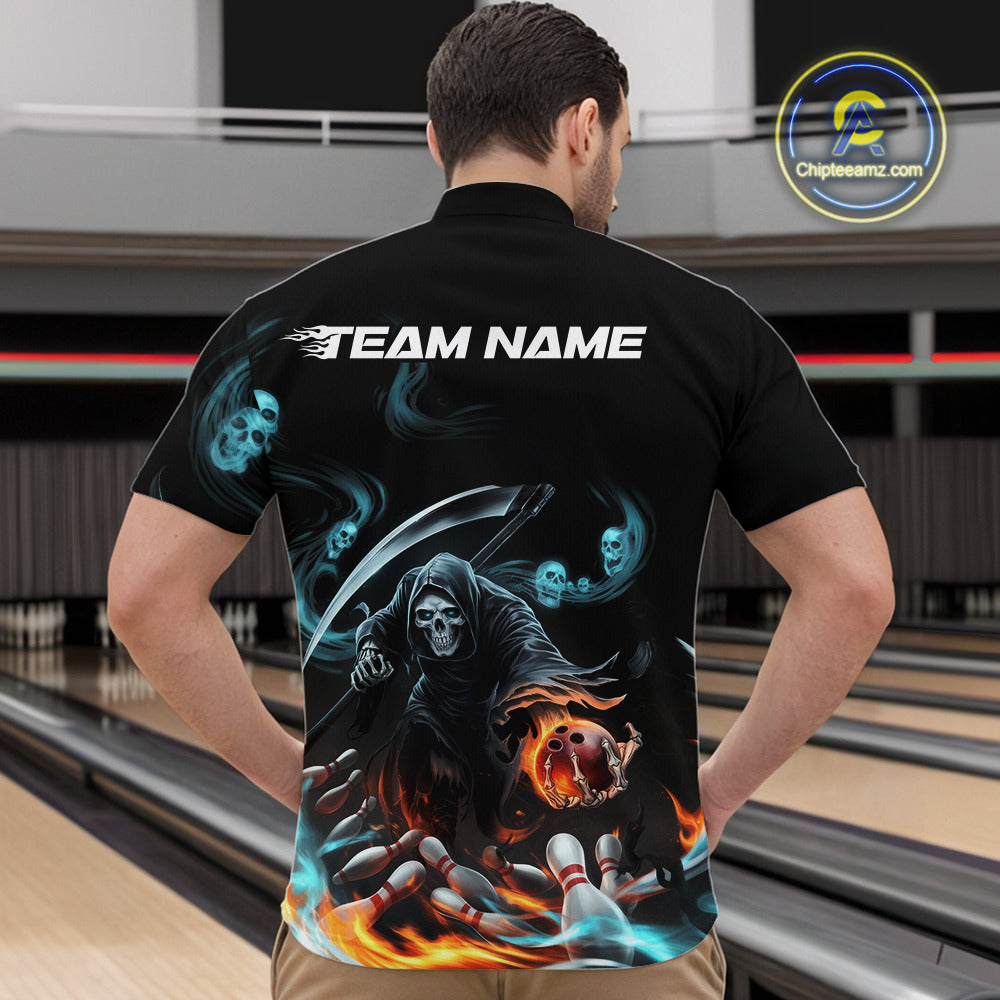 Custom Blue Skull Smoke Grim Reaper Bowling Men Quarter-Zip Shirt, Halloween Bowling Jerseys IPHW9900