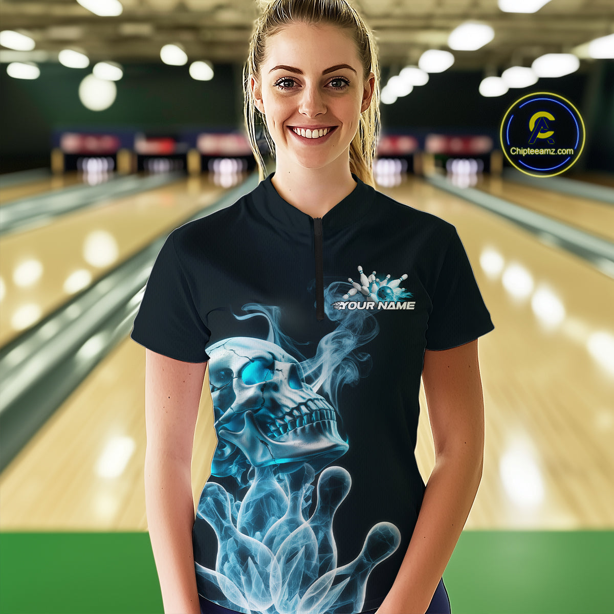 Custom Blue Flame Smoke Skull Bowling Women Quarter-Zip Shirt, Halloween Bowling Outfit IPHW9494