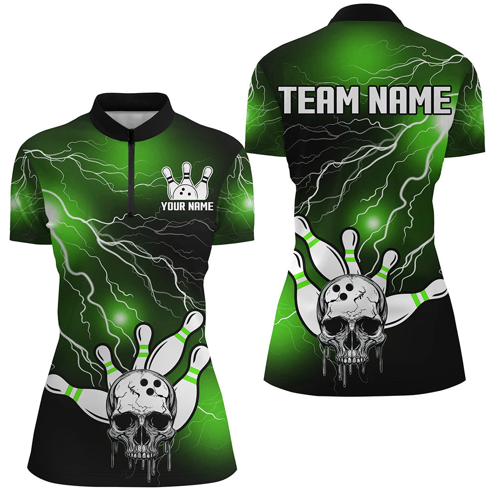 Skull Bowling 1/4 Zip Shirt For Men & Women Light Thunder Green Bowling Team Jersey Halloween BDT541