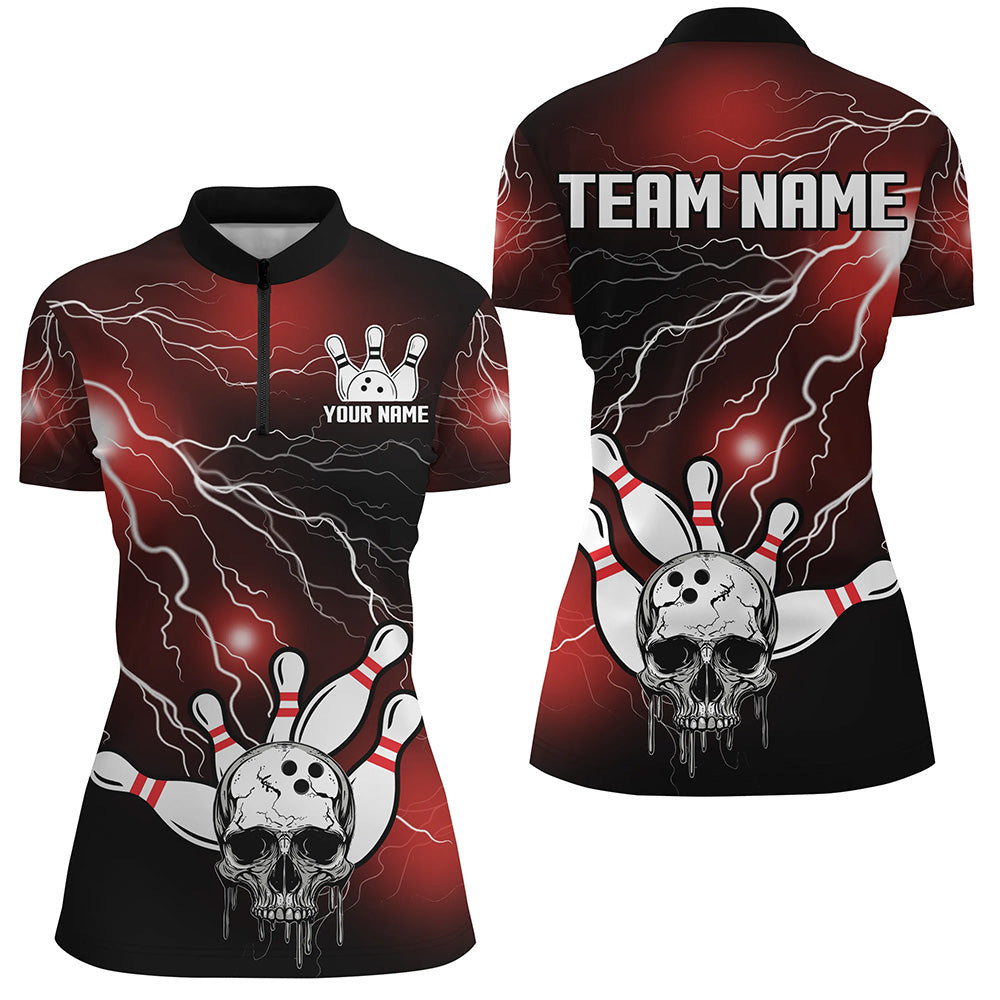 Skull Bowling 1/4 Zip Shirt For Men & Women Light Thunder Red Bowling Team Jersey Halloween BDT541