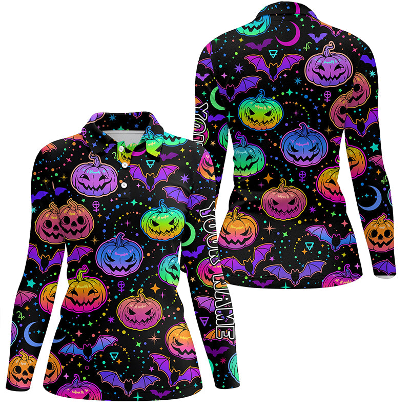 Funny Womens golf polo shirt colorful neon black Halloween background custom golf attire for women NQS6153